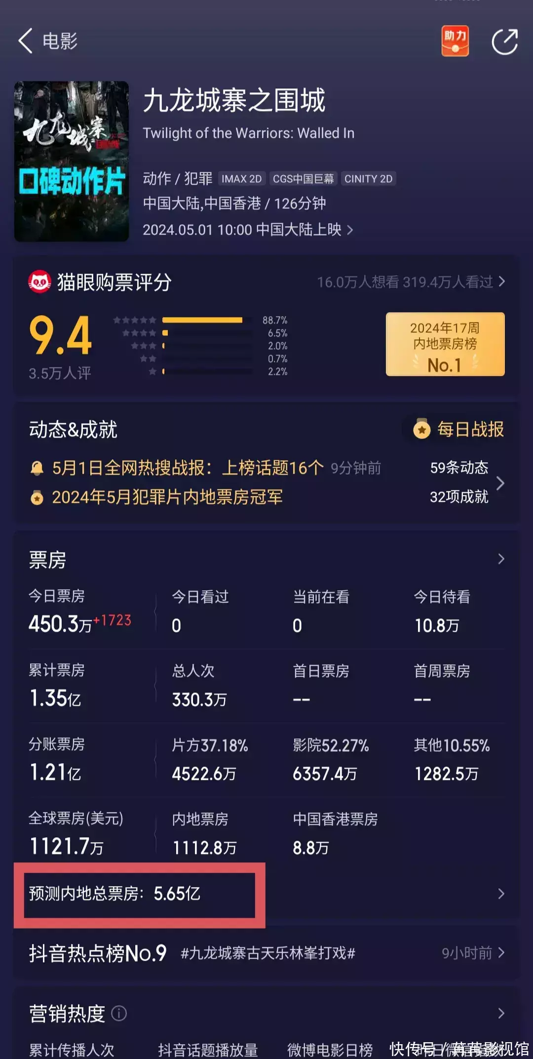 (2)香港本土电影方面古天乐新片《九龙城寨之围城》优先场票房达到68万港币,单日票房超过50万港币,按照目前的趋势来看首周票房预计将在700万港币到1000万港币之间,总票房将在2000万港币左右。值得一提的是该片中国内地市场与香港市场同步上映,中国内地市场首日票房突破5000万人民币,再加上提前点映场累计总票房1.3亿人民币,按照猫眼平台预测总票房将在5.65亿人民币。