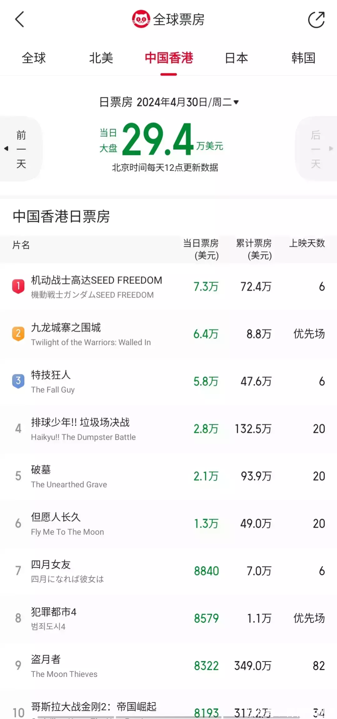 (1)单日票房榜前十的影片,香港本土电影有《九龙城寨之围城》、《但愿人长久》和《盗月者》等三部上榜,美国电影有《特技狂人》和《哥斯拉大战金刚2:帝国崛起》两部上榜,日本电影有《机动战士高达SEED FREEDOM》、《排球少年!!垃圾场决战》和《四月女友》等三部上榜,韩国电影有《破墓》和《犯罪都市4》两部上榜。
