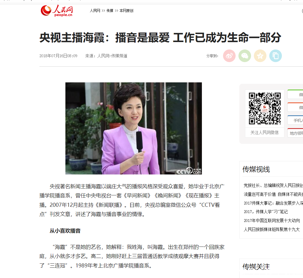 信息源:《央视主播海霞:播音是最爱 工作已成为生命一部分》人民网
