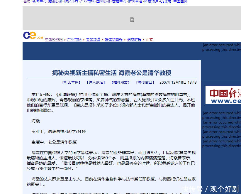 信息源:《揭秘央视新主播私密生活 海霞老公是清华教授》中国经济网
