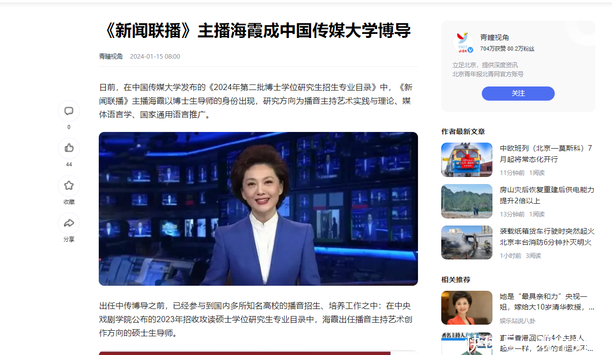 信息源:《新闻联播》主播海霞成中国传媒大学博导 青瞳视角