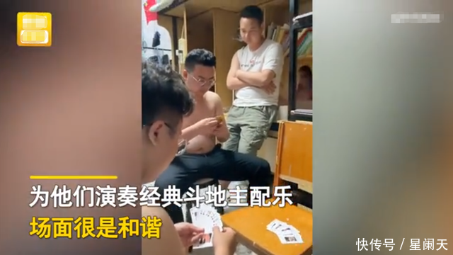 这位男生一只手撑着自己的身子,半躺在床上弹起了琵琶给室友助兴,演奏的曲目正是斗地主里面的经典配乐,而打牌的几个男生对此非常的淡定,好像已经习惯了这样,依旧在认真的打牌,谁也没有理会弹琵琶的男生。而弹琵琶的这位男生也沉浸在自己的世界当中,即使没人理他,他也弹得兴致勃勃。整个场面看起来其乐融融,又透露着一丝搞笑。