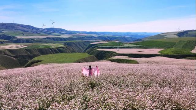 但最吸引人的,还是那50万亩荞麦花海,粉色的花,蓝天白云,风车井架,丘陵沟壑,烽台古堡,这就是定边的"小西藏"。