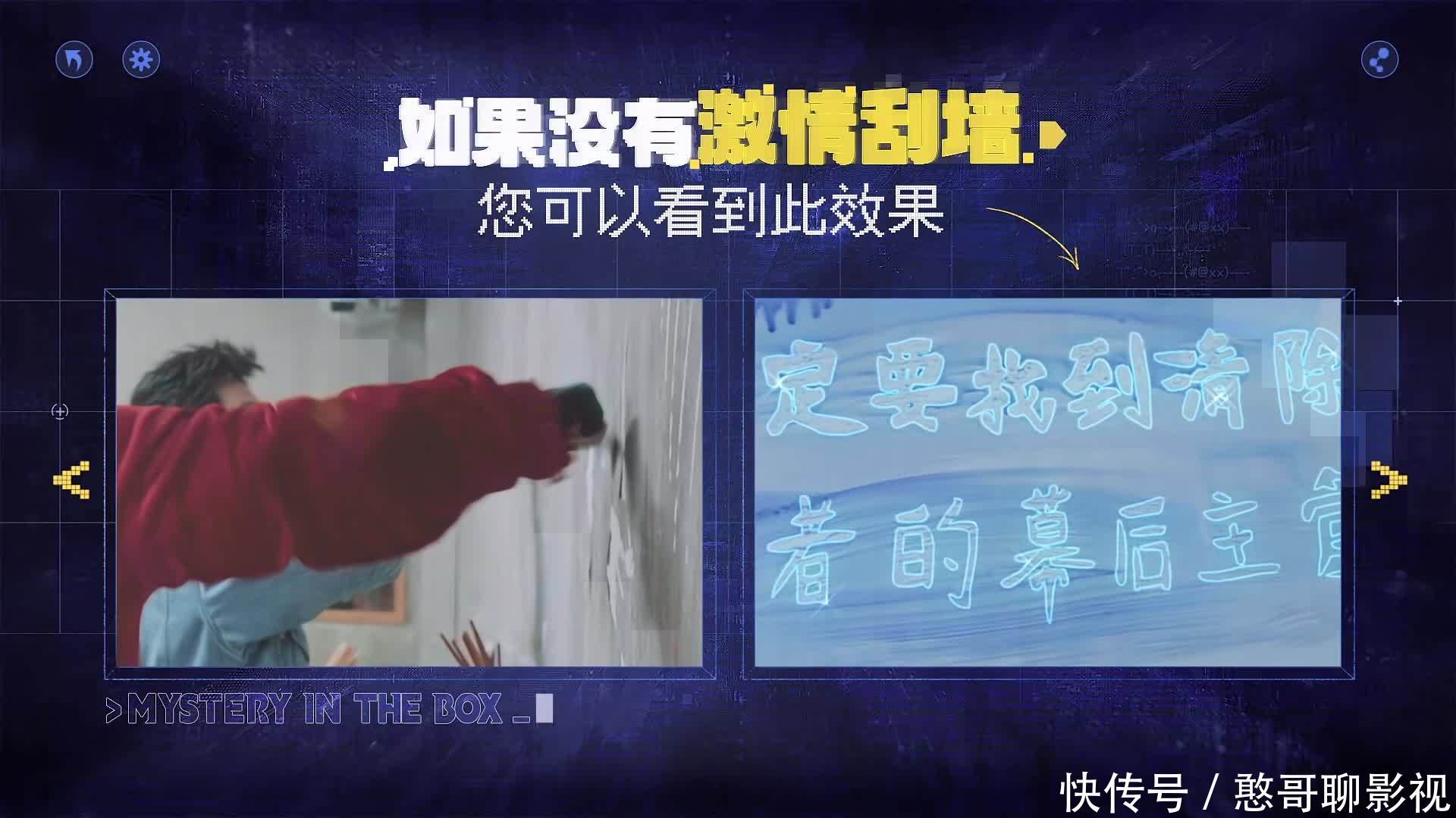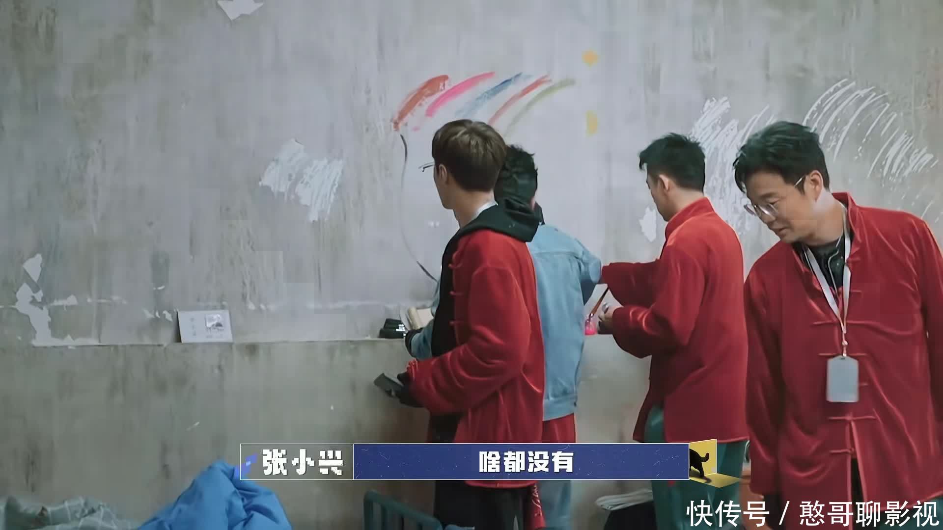 墙的下面就放置了八种不同颜色的颜料,玩家们就开始用颜料作画,唯独张艺兴不听指令,竟然拿起一个锤子敲打墙面,又用工具刮墙,一时粉末飞扬,几个玩家都不得不退让,张艺兴却越刮越起劲,但他刮了一大片墙,却什么线索都没有。
